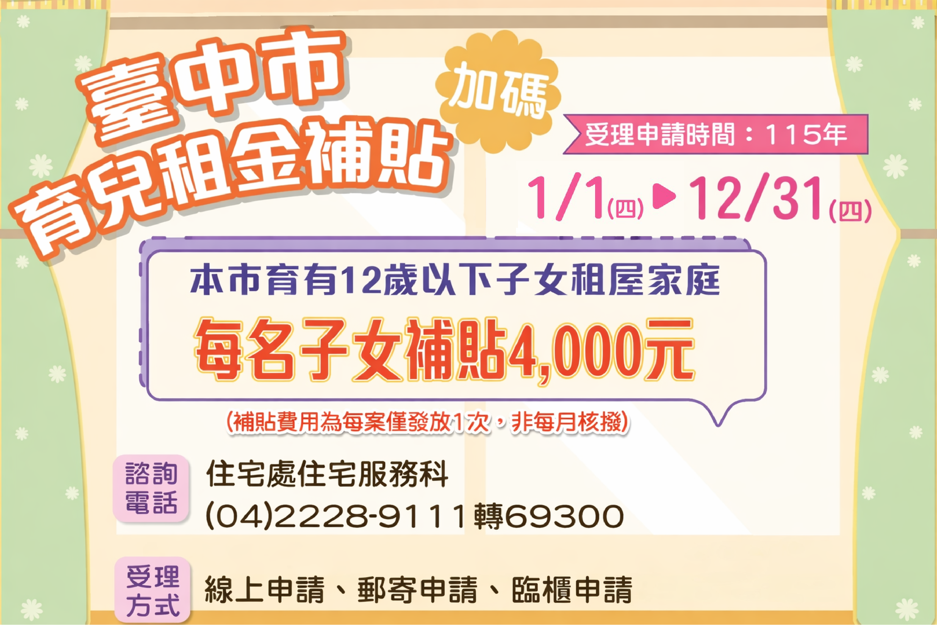 115年「300億元中央擴大租金補貼」隨到隨辦服務不中斷! 臺中市住宅發展工程處‧住宅服務科 2026-01-09 為簡政便民,原114年度租金補貼之舊戶(114年有撥款紀錄者及114年提出申請經審查合格者)直接帶入申請,無須再提出申請! 一、受理時間: 115年1月1日(星期三)上午09:00至115年12月31日(星期三)下午05:00 二、申請方式: (一)鼓勵全面線上申請: 申請人於受理期間,備妥檢附文件至內政部國土管理署網站首頁右側「重要政策」→「三百億元中央擴大租金補貼線上申請」網站提出,存...