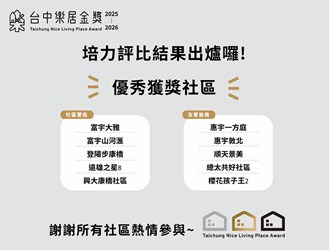 👏組別前5名得獎社區如下:【社區營造】共5名:富宇大雅、富宇山河滙、登陽步康橋、遠雄之星8及興大康橋社區。【友善設施】共5名:惠宇一方庭、惠宇敦北、順天景美、總太共好社區及櫻花孩子王2。